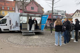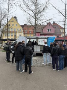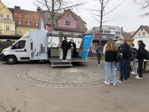 Los ging es nach der ersten großen Pause auf dem Schulhof an unserem Messemobil. Nach einer kurzen Begrüßung haben wir die Gruppe aufgeteilt, damit alles in Ruhe ablaufen konnte und genügend Zeit für Fragen blieb.