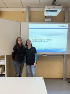 Parallel dazu fand im Klassenraum ein Einblick in die Ausbildung bei Halder statt. Unsere Azubinen haben die verschiedenen Ausbildungsberufe vorgestellt, den Ablauf erklärt und Fragen rund um den Alltag im Unternehmen beantwortet.