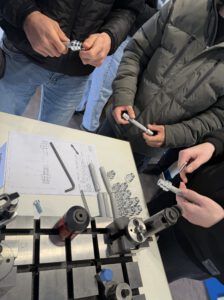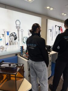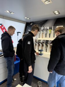 Im mobilen Showroom konnten die Schüler selbst aktiv werden. Die einzelnen Teile für eine kleine Hantel wurden vorab in unserer Lehrwerkstatt gefertigt und konnten vor Ort von den Schülern zusammengebaut werden. Im Anschluss wurde die Hantel mit unserem Lasergerät personalisiert, sodass jeder sein eigenes Teil mitnehmen konnte. Gleichzeitig haben unsere Azubis Einblicke in unsere Produkte gegeben und auch Projekte aus den letzten Ausbildungsjahren vorgestellt.